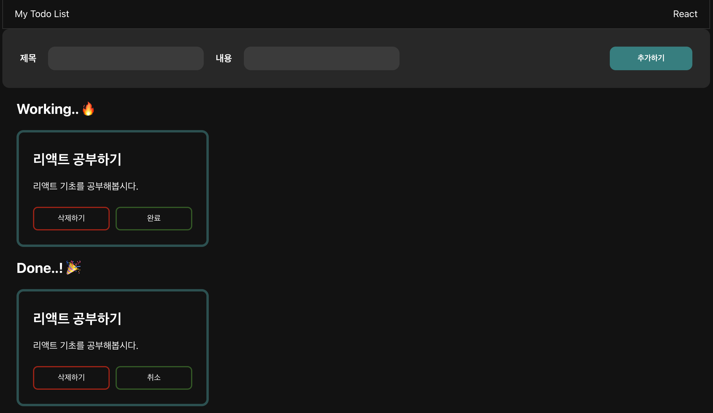 제목, 내용 입력 후 추가하기 버튼으로 Working section에 카드 형태로 등록 - todo 분리하기 (Working, Done)